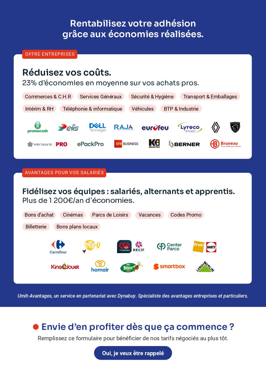 Bientôt le coup d’envoi d’Umih Avantages : grâce au partenariat avec Dynabuy, leader français des achats groupés pour les TPE/PME, les adhérents et leurs salariés pourront très prochainement bénéficier de tarifs négociés auprès de fournisseurs sélectionnés pour leurs usages quotidiens professionnels ou personnels.